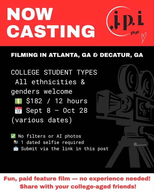 A gig is available for those who look college-aged to make some extra cash by working as a paid movie extra on set. The movie filming in Atlanta is called JPI. The project is described a new feature film which will primarily filming in Georgia this summer and into the fall. However, JPI is the working title, so the actual name of the project has not been released…well, as of yet..
