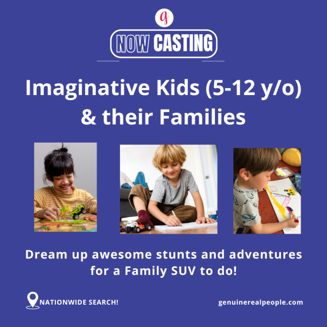 Genuine is now casting creative and imaginative kids ages 5–12 and their families for a nationwide online audition opportunity. This fun, family-friendly project is looking for English- and Spanish-speaking families of all ethnicities who love to dream big and think outside the box.