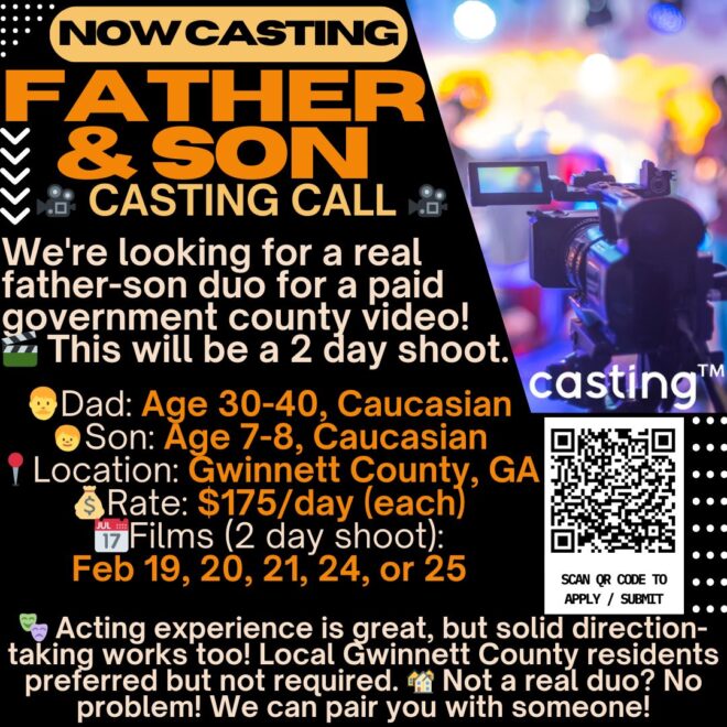 Casting TaylorMade is seeking a Caucasian father (30s-40s) and son (approximately 7-8 years old) for a paid government county video filming in Gwinnett County, GA.