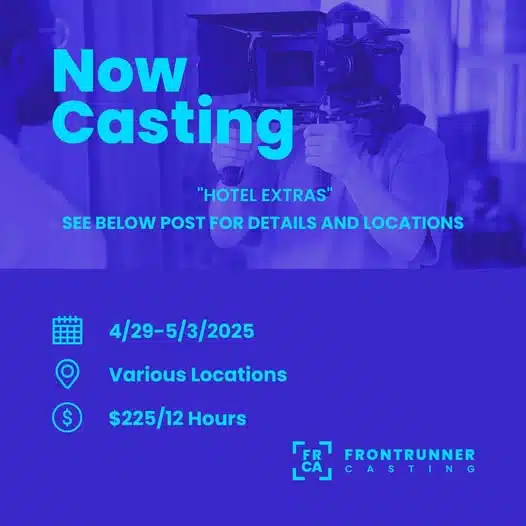 Frontrunner Casting is currently seeking paid background extras for an upcoming hotel brand film shoot taking place across various Florida locations between April 29 and May 3, 2025. Selected participants will be compensated $225 for up to 12 hours of work per shoot day. The casting team is looking for clear, current photos and detailed availability from interested applicants.
