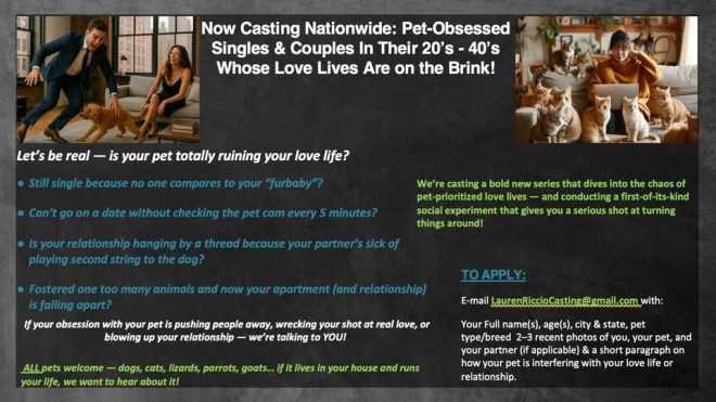 NOW CASTING NATIONWIDE: PET-OBSESSED SINGLES & COUPLES IN THEIR 20’S-40’S WHOSE LOVE LIVES ARE ON THE BRINK!