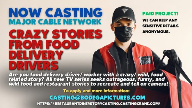 If you’ve ever worked as a food delivery driver or restaurant worker and experienced a delivery so chaotic, hilarious, or downright unbelievable it still makes you laugh (or cringe), this is your chance to share it on camera. Producers are especially interested in longer stories full of unexpected twists, big personalities, and moments you’ll never forget—whether it was a customer meltdown, a bizarre order, a creepy encounter, or a food fail that deserved to go viral.