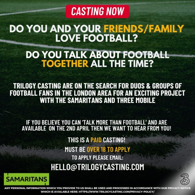 Trilogy Casting are on the search for football fans in the London Area for an exciting project with the Samaritans and Three Mobile.