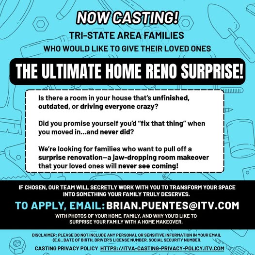 Whether it’s the kitchen that’s been half-remodeled for years, the basement that turned into a storage zone, or a room you’ve been promising to fix “someday,” this is your chance to make it happen. The show will feature families pulling off a heartfelt and jaw-dropping renovation surprise that will hopefully leave the loved ones speechless.