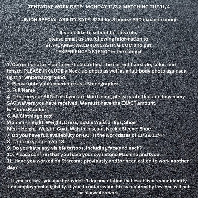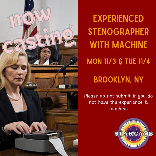 Waldron Casting is seeking an experienced Court Stenographer with their own machine for paid background work on the TV series Starcams!