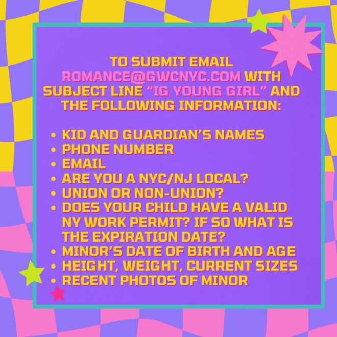To be considered, please email romance@GWCNYC.com with the subject line “IG YOUNG GIRL” and include the following: