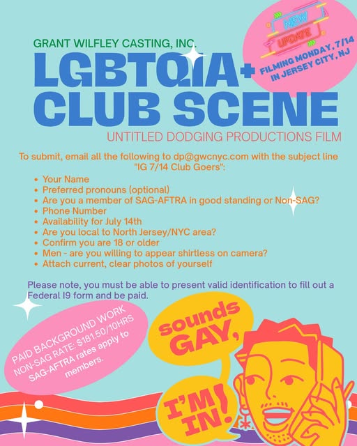 Grant Wilfley Casting, Inc. is seeking background actors for an LGBTQIA+ club scene in the untitled Dodging Productions film, shooting Friday, July 11 in Jersey City, NJ. The production is looking for individuals 18+ who are local to the North Jersey/NYC area. Men should note if they are willing to appear shirtless on camera. Both SAG-AFTRA members and non-union talent are welcome to apply; SAG-AFTRA rates apply to members, and the non-union rate is $181.50 for 10 hours.