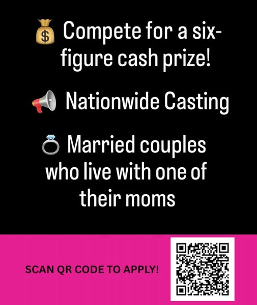 This nationwide casting call is open to competitive duos who aren’t afraid to put their family dynamics to the test for a chance to win a six-figure cash prize. Producers are looking for couples with strong personalities and a mother or mother-in-law who isn’t shy about speaking her mind.