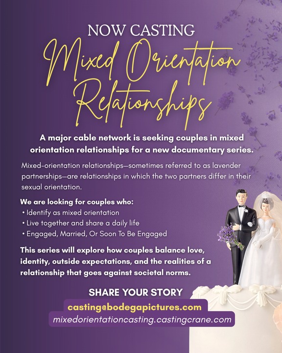 A major cable network and an acclaimed production company are casting couples in mixed-orientation or lavender-style relationships for a new documentary series. We want to hear from couples who live together, are committed in their own way, and have a compelling story to share. The series will explore daily life, communication, outside pressures, and the balance between love, identity, and shared goals.