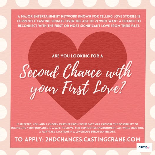 A MAJOR ENTERTAINMENT NETWORK known for telling love stories is currently casting SINGLES over the age of 21 who want a chance to reconnect with the first or most significant love from their past.