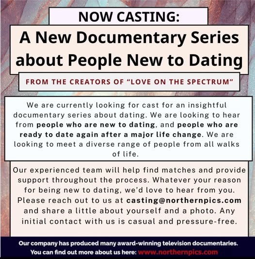 A new documentary series from the Emmy-winning producers of “Love on the Spectrum” is now casting for a major streaming platform. This series will spotlight individuals from all backgrounds who are just beginning their dating journey or haven’t had traditional opportunities to explore romance.