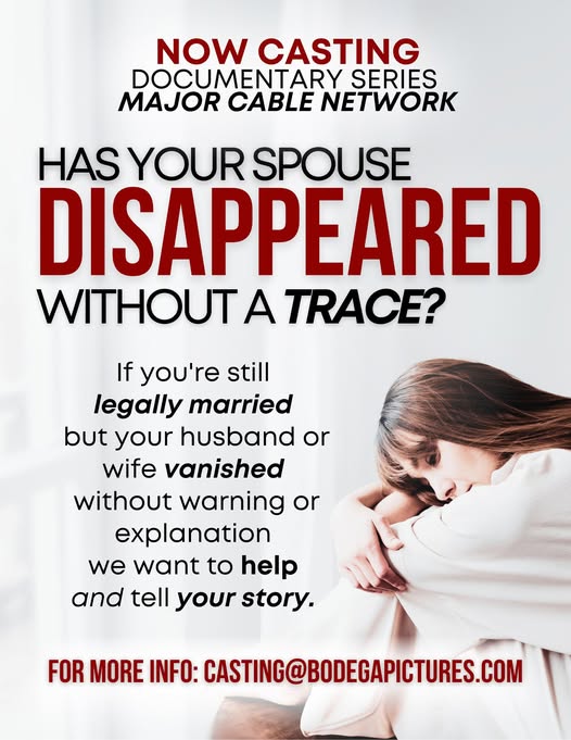 If you are still legally married but your husband or wife disappeared suddenly—with no goodbye, no contact, and no known whereabouts—this series aims to help you search for answers and provide closure. Whether your spouse walked away from the relationship or vanished under mysterious circumstances, producers want to hear your story.