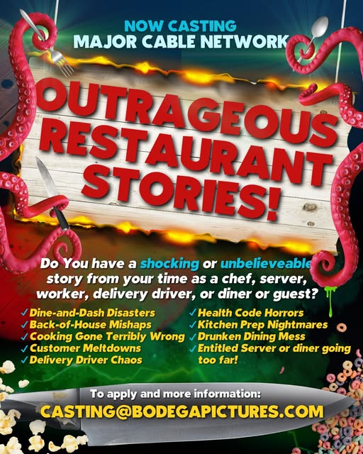 A major cable network, in partnership with a renowned production company, is developing a brand-new unscripted series that will uncover the most jaw-dropping, cringe-worthy, and chaotic moments from the world of food service — and they’re looking for real people with real, unforgettable restaurant stories to feature.