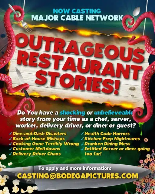 Whether you’re a restaurant employee, a delivery driver, or a customer who lived through an unbelievable dining experience, producers want to hear your story. No incident is too wild or too weird — if it happened in or around a restaurant, it could be perfect for this new show.
