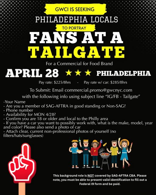 GWCI has announced it is currently seeking Philadelphia-area locals to portray fans at a tailgate for an upcoming commercial for a well-known food brand. The shoot will take place on Monday, April 28 in Philadelphia, PA.