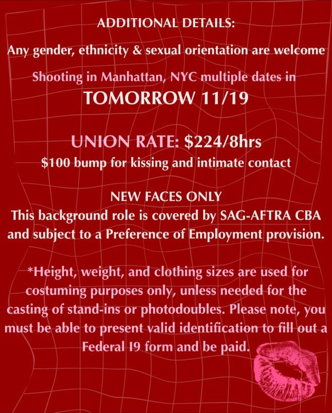These are paid roles. The information is below. Please note that you must be a NYC local as no travel is being provided. “One Night Only” will be filming in Manhattan in October, November & December.