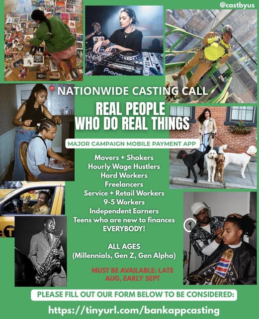The production team is searching for real people (Not actors or people looking to be actors) from all walks of life who are active earners and go-getters. This includes movers and shakers, hourly wage workers, freelancers, retail and service industry employees, 9-to-5 professionals, independent earners, and even teens who are just starting to navigate their finances.