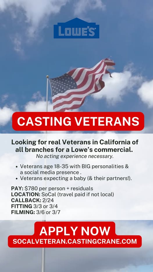 Asjai Lou Casting is seeking real military veterans from all branches to appear in an upcoming Lowe’s commercial. This casting opportunity is open to veterans in California, and no acting experience is required.