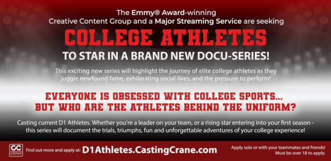 The Emmy® Award-winning Creative Content Group, in collaboration with a major streaming platform, is casting Division 1 college athletes for an all-new docu-series!