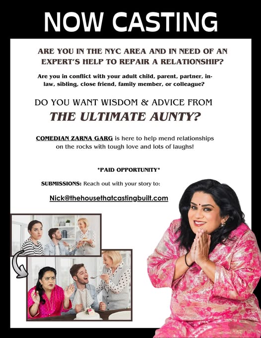 If you’re NYC-based and willing to share your story on-camera for a non-airing shoot, comedian Zarna Garg is ready to bring her signature blend of tough love and humor to help you mend those rocky relationships.