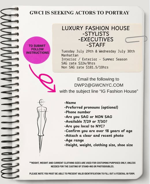 Tentatively shooting on July 29th / July 30th in Manhattan.To submit, email DWP2@gwcnyc.com with the subject line “IG Fashion House” with the following info