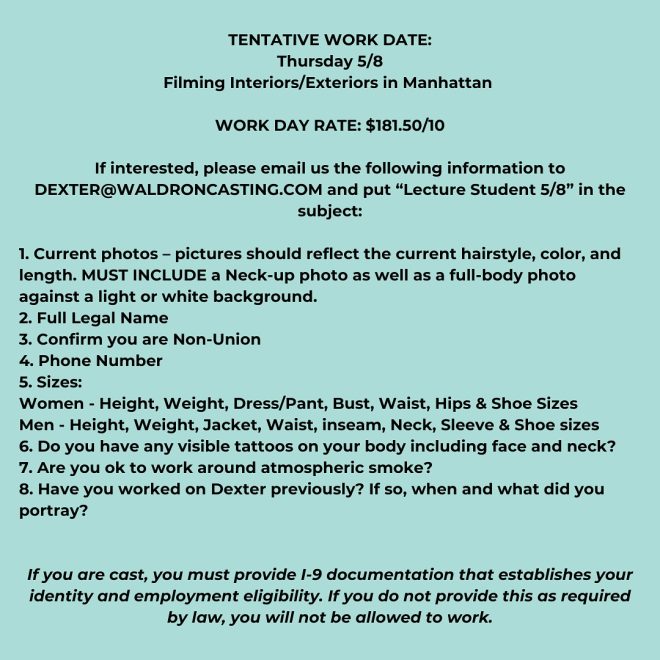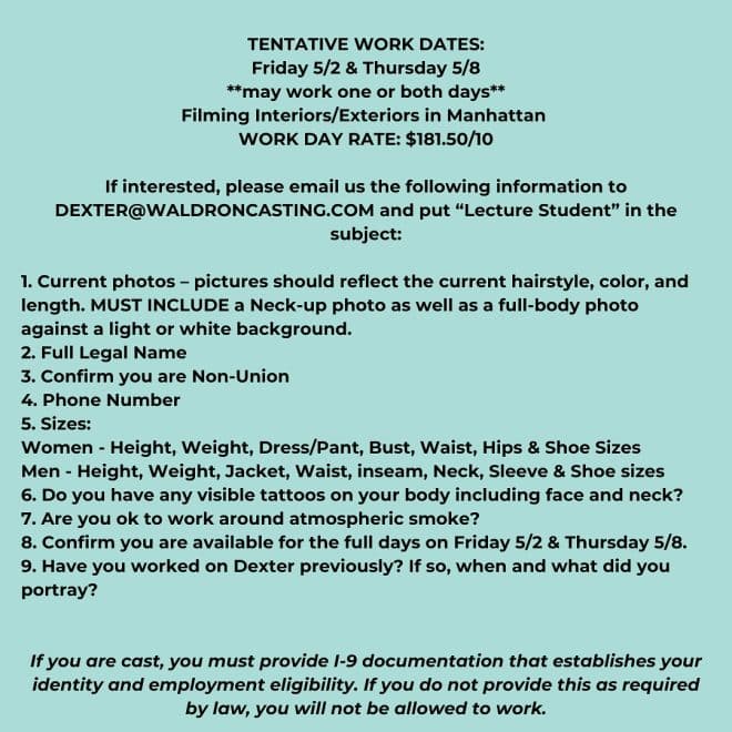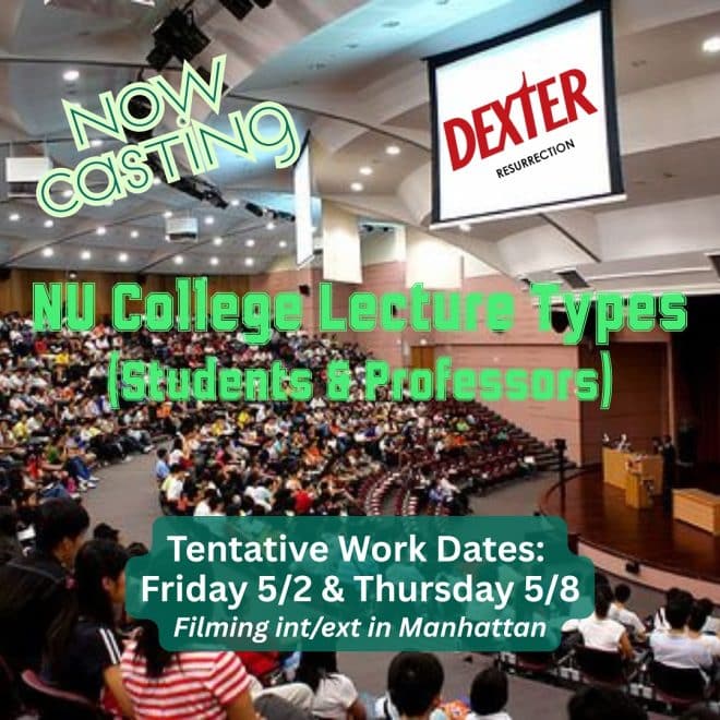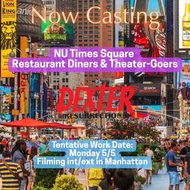 Calling extras for Showtime’s series Dexter in NYC! Dexter: Resurrection. is filming the new chapter in the state of New York and has issued various casting notices in New York City as well as other parts of New York for other filming locations.