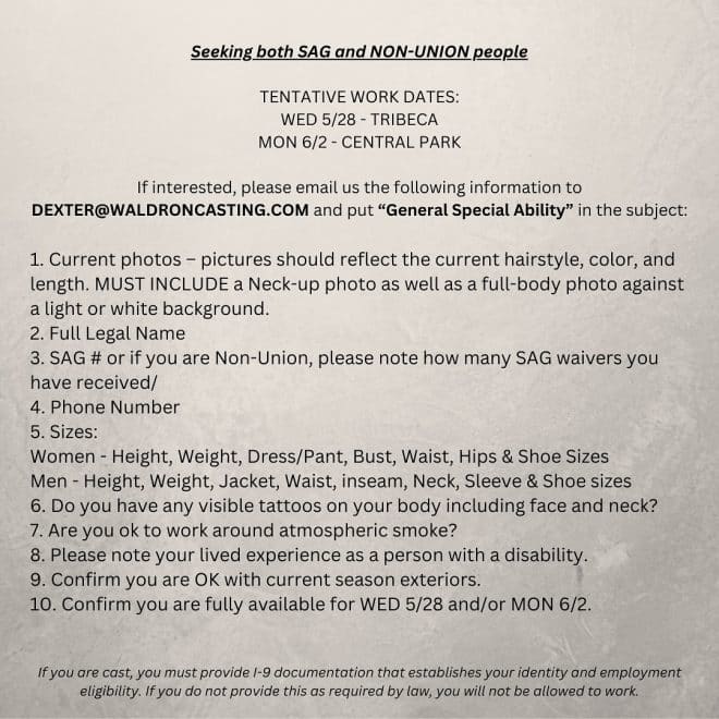 Waldron Casting is seeking individuals with visible physical disabilities for background work on the Showtime series Dexter: Resurrection.