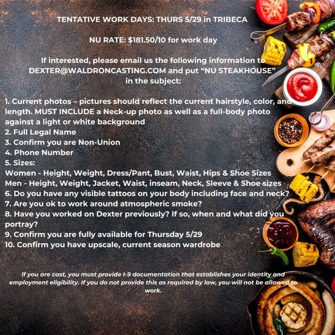 Waldron Casting is seeking NON-UNION talent to portray upscale, chic types dining at a fancy restaurant for the TV series Dexter: Resurrection.