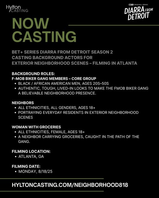 The hit BET+ series returns as Diarra Brickland’s sharp wit and messy sleuthing take center stage again, blending comedy, drama, and a fresh spin on the detective genre. Hylton Casting is seeking background actors to fill various small, non speaking roles to work on set in an episode of the show.