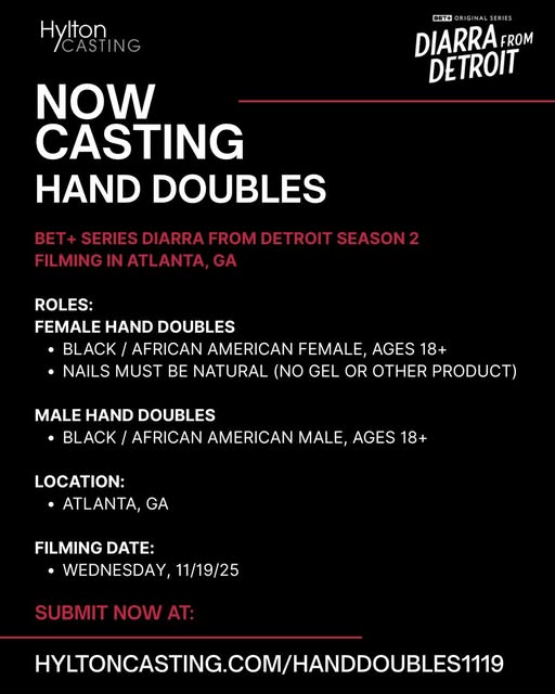 Hylton Casting is currently casting hand doubles for the BET+ series Diarra From Detroit Season 2, filming in Atlanta, GA.