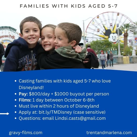 Currently casting a non-union commercial for Disneyland where we are looking for families with kids between the ages of 5-7!