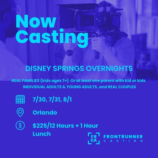 A Disney production filming overnight at Disney Springs in Orlando, FL is now seeking REAL families and REAL couples in Orlando area.