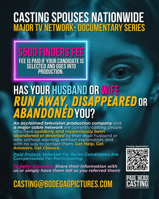 Producers are seeking individuals whose legal husband or wife has suddenly and mysteriously disappeared without warning, leaving them with no explanation and no way to make contact. The series will follow the stories of abandoned spouses still legally married and searching for answers, offering a chance to track down missing partners and find long overdue closure.