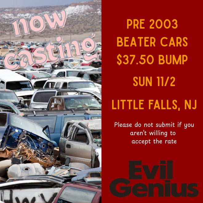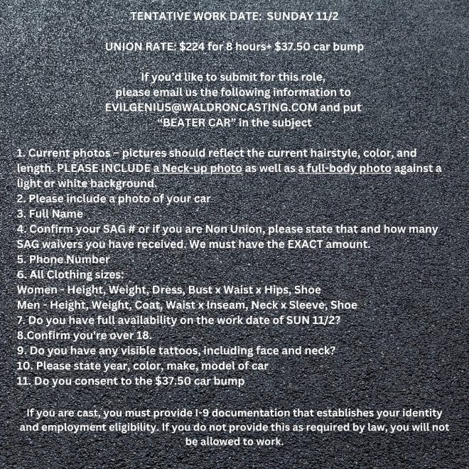 If you’d like to submit for this role, please email us the following information to EVILGENIUS@WALDRONCASTING.COM and put “BEATER CAR” in the subject
