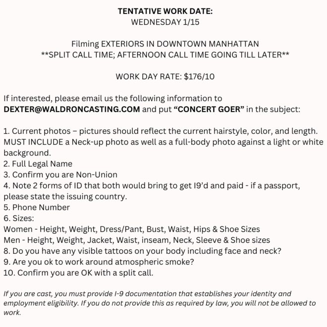 If interested, please email us the following information to DEXTER@WALDRONCASTING.COM and put “CONCERT GOER” in the subject:
