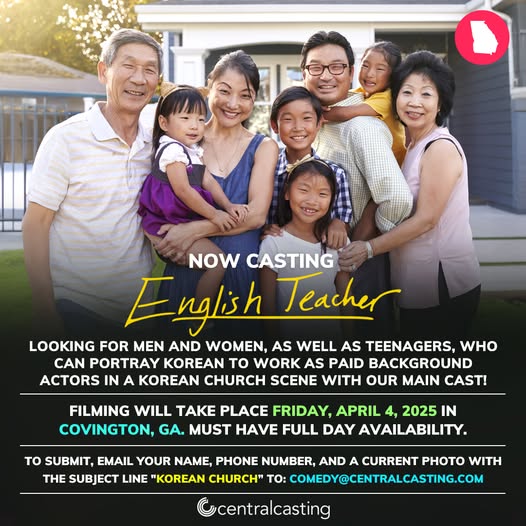FX’s, English Teacher, is currently seeking men, women, and teenagers who can portray Korean individuals for a church scene featuring the main cast. Filming will take place in Covington, GA, on Friday, April 4, 2025, and all applicants must have full-day availability.