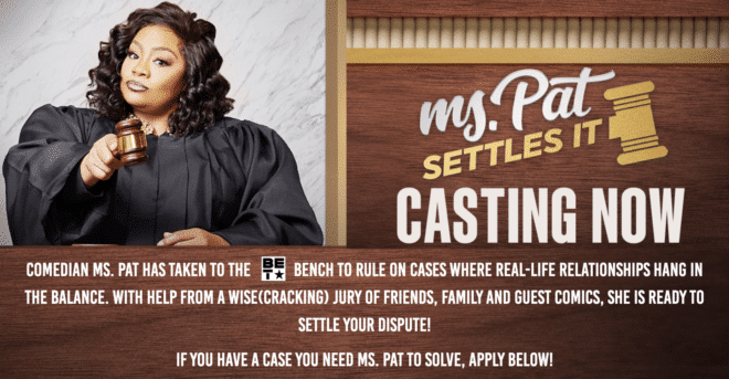 Comedian Ms. Pat has taken to the BET bench to rule on cases where real-life relationships hang in the balance. With the help of a wise(cracking) jury of friends, family, and guest comics, she is ready to settle your dispute!