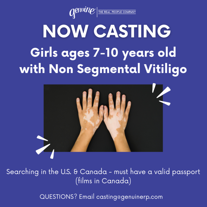 Submit your child for consideration by visiting the official casting link here: https://genuinerealpeople.com/casting-girls-7-10yrs-old-with-non-segmental-vitiligo/