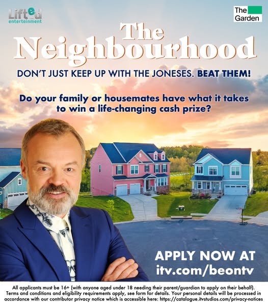 ITV’s new reality competition series, The Neighbourhood, is now casting across the UK. Hosted by Graham Norton and produced by Lifted Entertainment, this groundbreaking show challenges households to compete in a high-stakes, street-sized game—where only one household will walk away with a life-changing cash prize.