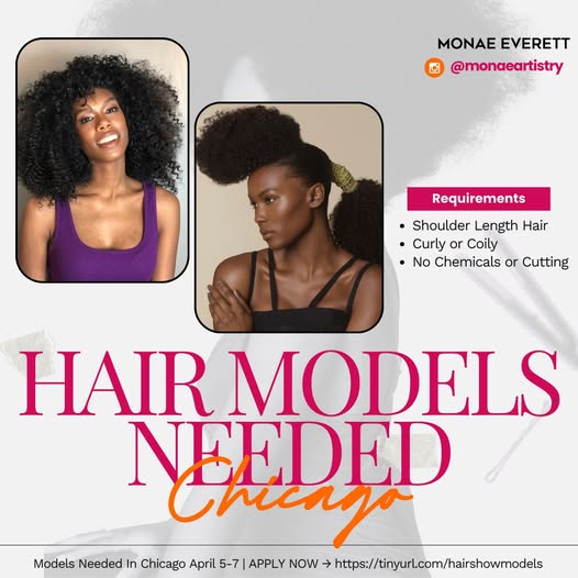 Celebrity hairstylist and educator Monae Everett (@MonaeArtistry) is seeking hair models for upcoming hair shows in Chicago from April 5-7.
