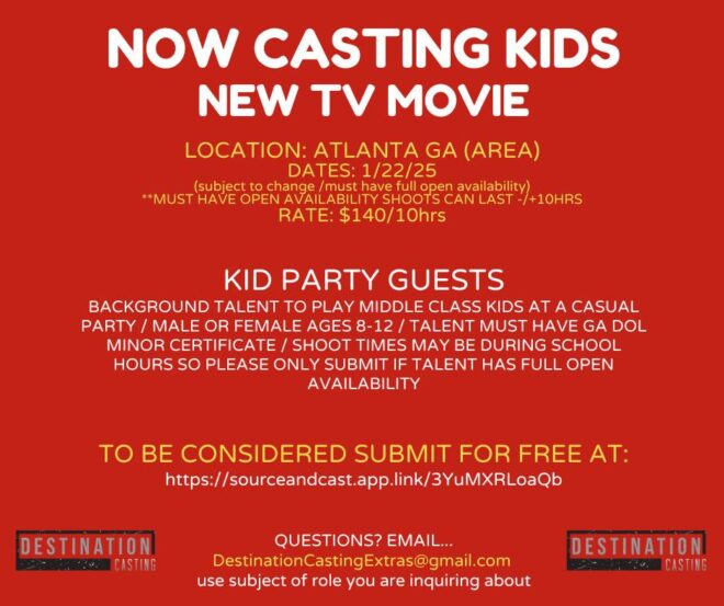 Calling all talent in the Atlanta area! Casting for a new TV movie filming on January 22, 2025 (date subject to change). With roles ranging from featured characters to background extras, there’s a place for everyone. Kids aged 8–12 can shine as party guests (GA DOL Minor Certificate required), while adults can take on roles as park-goers, coffee shop patrons, movers, or the featured role of “Another Man” with a clean-cut look. Rates range from $140–$150/12 hours, and open availability is essential as shoots may run up to 12 hours.