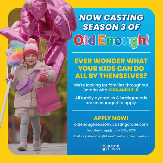 Producers are seeking Ontario-based families with young children (ages 3–5, or sibling pairs 2–6) to take part in this heartwarming and entertaining show, which follows little ones as they complete their very first independent errands — with cameras and a safety team close by. Filming takes place over one day in September or October 2025, and families of all dynamics and backgrounds are encouraged to apply.