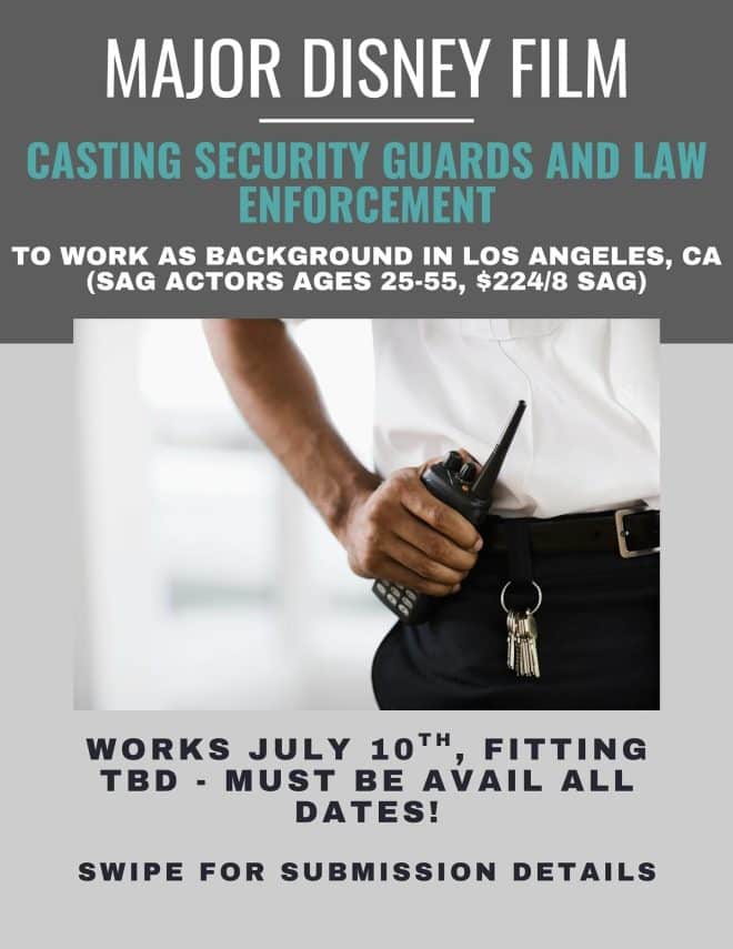 A major upcoming Disney feature film is now casting SAG background actors to portray security guards and law enforcement officers for a scene filming in Los Angeles.
