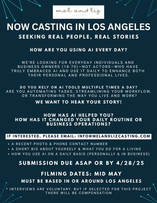 Mel and Liz Casting is currently seeking Los Angeles-based individuals who actively incorporate artificial intelligence into both their personal and professional lives. This is a non-acting opportunity for real people, ages 18 to 70, who genuinely rely on AI tools to enhance their daily routines, streamline workflows, automate tasks, or transform the way they operate in business and life.