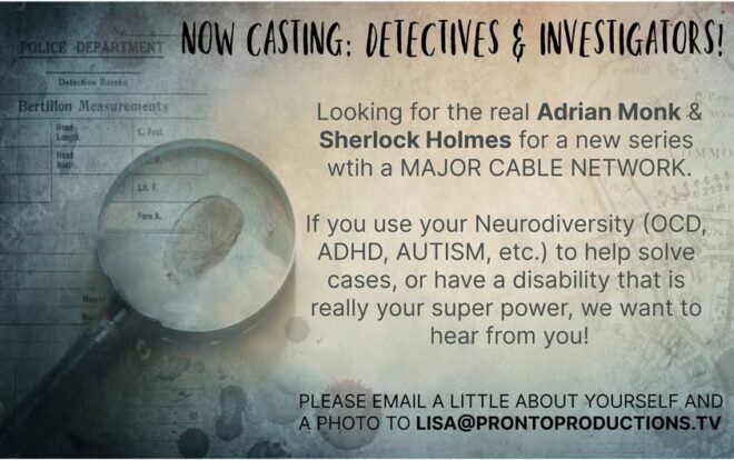 Now casting detectives and private investigators who use their neurodiversity (OCD, ADHD, Autism, Tourettes, etc) as a superpower — or their disability (wheelchair, blindness) as an ability — to help solve cases. Some of the best detectives have ADHD so we’re looking to showcase that for a major cable network!
