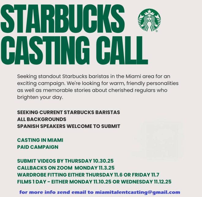 Starbucks is launching a new campaign in Miami and is currently casting real Starbucks baristas to be featured. The team is searching for standout personalities with warm, friendly energy and memorable stories about regular customers who make their days brighter. This paid opportunity is open to current Starbucks employees of all backgrounds, with Spanish speakers strongly encouraged to apply. Diversity in race, body type, and ability is an important focus for this project. The ideal participants will have a natural charisma, confident energy, and the authentic motions that come from years behind the counter.