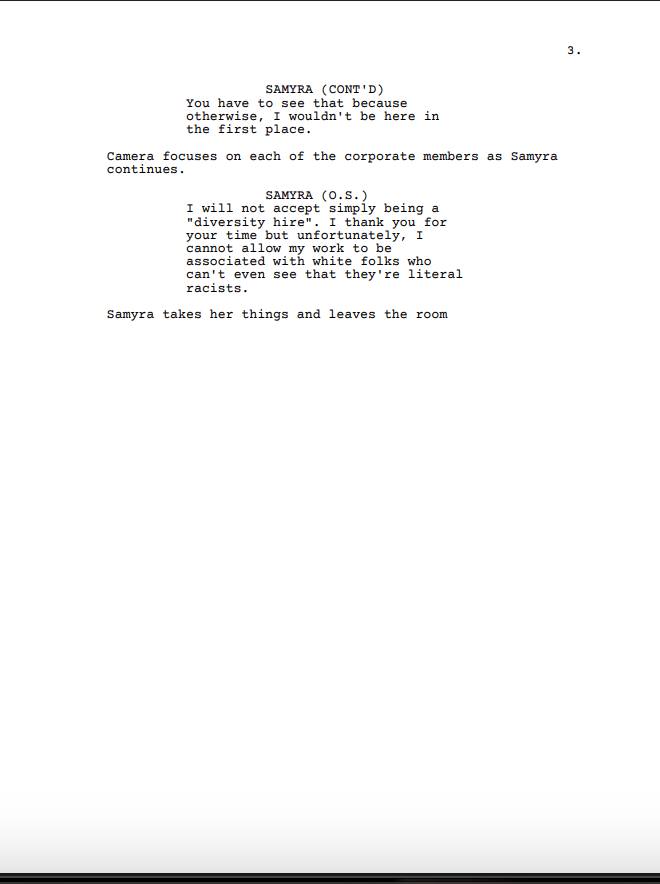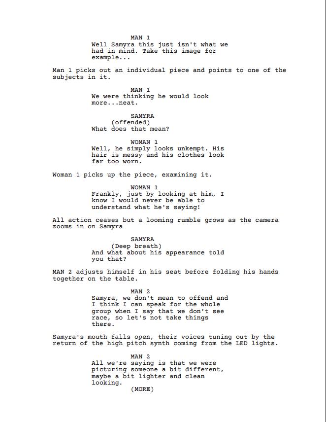 Samyra, an aspiring artist, is determined to succeed in the art world but finds herself battling racial expectations and biases. When she is interviewed by an all-white panel, she must decide whether to compromise her artistic integrity to fit their vision or stand firm and risk walking away.