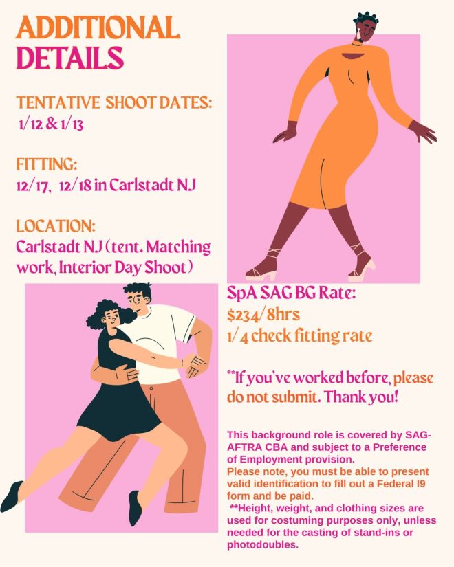 This project falls under the SAG-AFTRA background contract, offering a rate of two hundred thirty-four dollars for eight hours of work, plus a quarter check for the fitting. Talent must be able to present valid identification to complete hiring paperwork. Those who have already worked on this production are asked not to resubmit, and all height, weight, and sizing information will be used strictly for costuming unless needed for stand-ins or photodoubles.