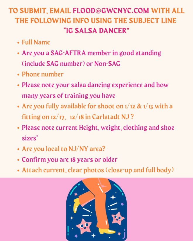 To submit, email FLOOD@GWCNYC.COM with the subject line “IG SALSA DANCER” and include the following: