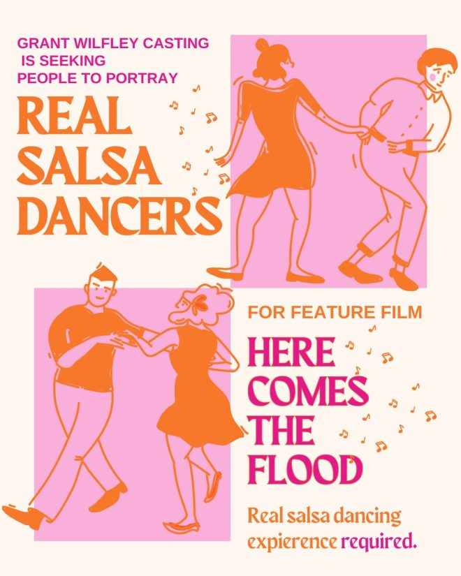 Grant Wilfley Casting is looking for real salsa dancers to appear as background talent in the upcoming feature film “Here Comes the Flood.“
